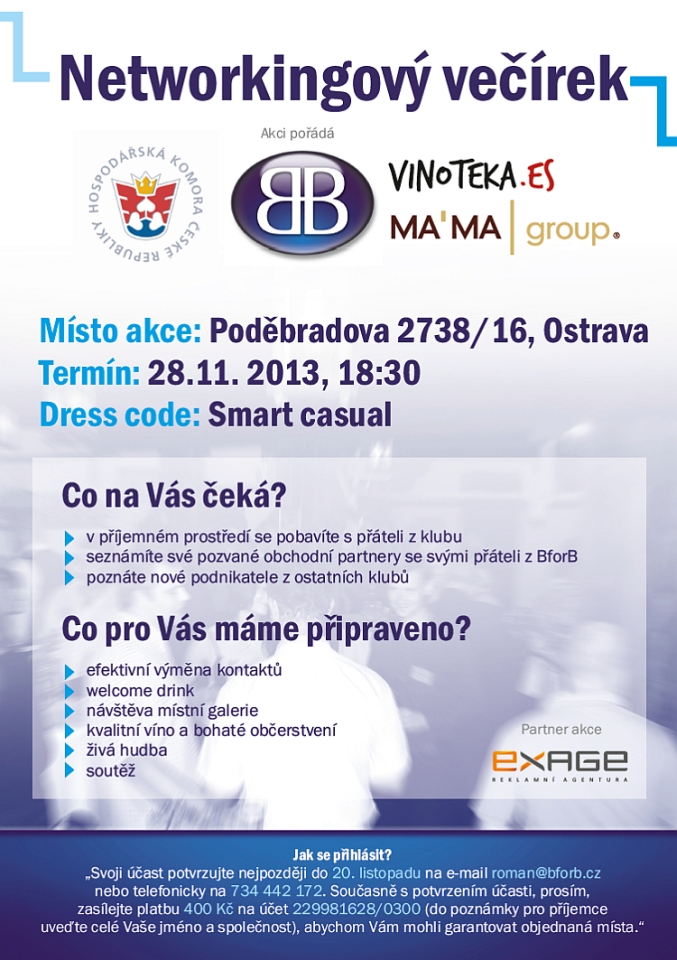 Již za pár dní pro Vás Business for Breakfast a Hospodářská komora uspořádá podnikatelský večírek. Načerpejte nové obchodní kontakty na manažery, majitele firem a významné osobnosti z ostravska a užijte si s námi krásný společenský večer!